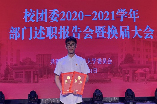 积极投身于党建团学工作和各类文体活动,荣获“校十佳主持人”、“优秀共青团干部”、“优秀学生干部”、“优秀青年志愿者”、“志愿服务先进个人”、“青马优秀学员”、“黄石市优秀共青团员”等荣誉称号;2019年参与撰写的政协模拟提案被推荐至共青团中央。