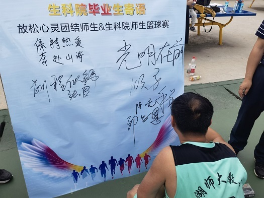 随着一声哨响,比赛正式开始。成熟和青涩在这里碰撞,年长和年少在这里较量。陈亮老师接到传球,向外运出,在中线的地方起跳投篮,球进了,场上观众齐齐呼喊,为这个漂亮的进球而喝彩。最终,老师组71:69险胜大四学生。赛后,大四学生和每个老师握手鞠躬,表达了他们对老师的感谢以及对生科院的留恋,并在展板上写下了对未来的美好祝愿。