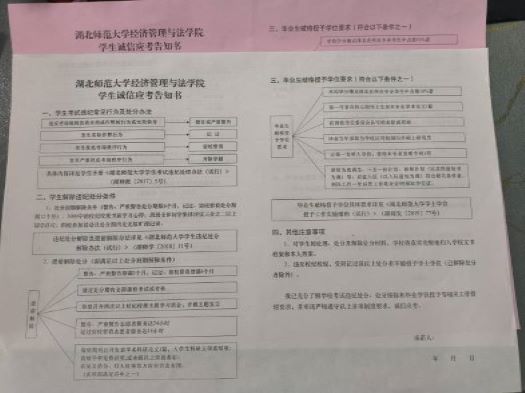 经管法学院依据《yl23455永利官网学生手册》相关规定制定《yl23455永利官网经济管理与法学院学生诚信应考告知书》,以结构图的形式呈现考试违纪行为处分、处分解除以及破格授予学位的要求,让人一目了然。该告知书一式两份,各班级学生负责人组织签订,学生本人签字后一份自己留存,一份由学院留存。