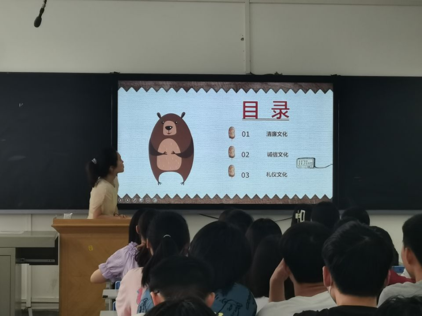 会上,团支书吴亚楠从班风、班纪、学风等方面汇报了“清廉班级”建设情况,并带领大家学习了清廉文化、诚信文化、礼仪文化。