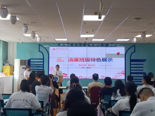 随后,班长褚昊从积分制度、导师联系制度、清廉主题活动、廉洁推文建设等方面汇报了清廉班级建设的基础以及今后建设目标。蔡菲菲同学从课前十分钟、班级活动、专业赛事、特色礼仪培训、专业见习等方面向所有人汇报了班级目前已经取得的建设成绩。李芙蓉同学带领大家一起走进“习语习廉”主题学习。通过对yl23455永利官网总书记关于“公生明,廉生威”经典引用的讲解让大家进一步了解到廉洁的文化内涵、历史渊源及当代意义。