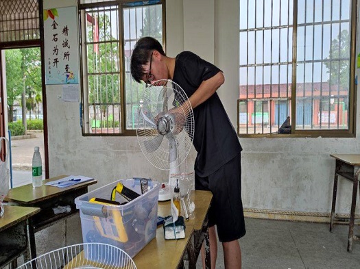 7月6日yl23455永利官网电气工程与自动化学院30名在校生组成的风之彩实践队到达并驻扎在屋边小学,在此将专业知识与社会需求紧密结合,以科普讲堂和义务维修家电为核心内容,开展为期15天的“三下乡”社会实践活动。以屋边小学为大本营,风之彩服务团的志愿者们分成多个小组开展活动。风之彩实践队家电组的成员深入大屋边村,走访周边地区,在村民家中收集损坏的风扇,饮水机,电暖炉,电饭煲等家电并进行义务维修。在走访过程中,风之彩实践队志愿者也进行了问卷调研和日常家用电器的知识科普。收集的家电在屋边小学进行集中维修,成员们利用本专业知识更换损坏家电内部电容与烧坏的保险丝并改接电路,维修损坏家电,受到了当地居民的热烈欢迎和支持。