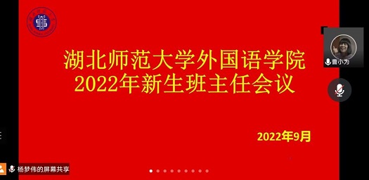 为进一步加强新生班主任及助班的队伍建设,提升班主任及助班的专业水平和职业素养,9月6日,外国语学院举行了2022年新生班主任线上会议暨迎新工作会。参与本次会议的有外国语学院党委副书记曹小为,辅导员黄志军、关巧、杨梦伟、罗兰、何俊生以及各班新生班主任和助班,会议由辅导员杨梦伟老师主持。