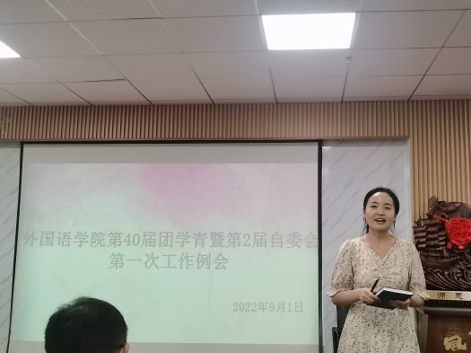2022年9月1日,外国语学院第40届团学青暨第2届自律委员会第一次工作例会在人文楼21B603会议室顺利召开,参会人员有外国语学院辅导员黄志军、关巧、杨梦伟、罗兰、何俊生及全体团学青、自律委员会成员。
