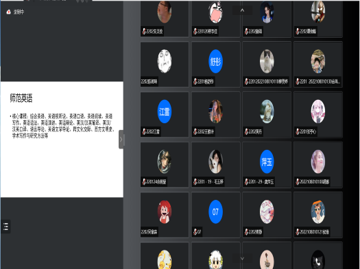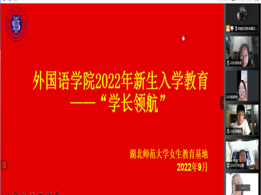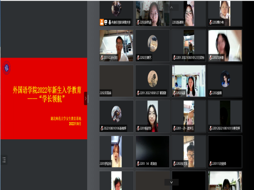 为了帮助新生尽快适应大学生活,了解本专业的学习方法及专业特色,为接下来的学习生活做好准备,外国语学院各新生班级于9月11日上午10时开展了“学长领航”线上入学教育活动,参与此次活动的是2022级新生班班主任、助班和全体2022级新生。