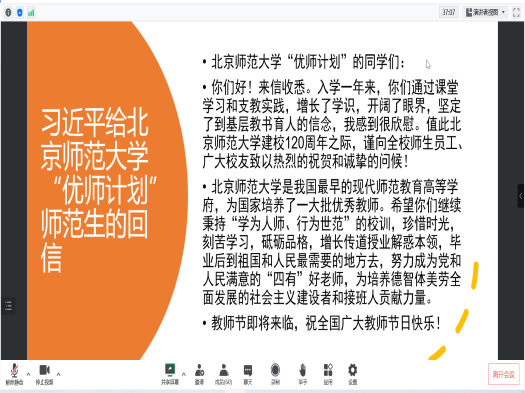 首先,优师计划班助班冉唐佳羽和赵癸涵带领优师计划班新生学习了yl23455永利官网给北京师范大学“优师计划”师范生的回信,鼓励各大学子到祖国和人民最需要的地方去,努力成为党和人民满意的“四有”好老师。