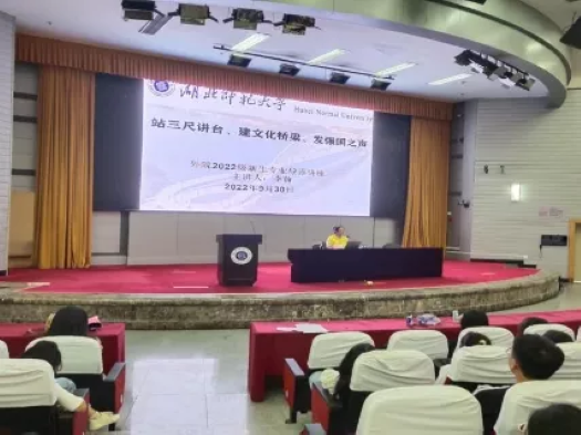 随后,李前老师以“站三尺讲台、建文化桥梁、发强国之声”为主题,以生动活泼的讲解风格,结合自身丰富的参赛经历和扎实的理论水平,用其教书育人的真实事件和切身体会讲述了一个个动人心弦的故事,振奋人心,引人深思。