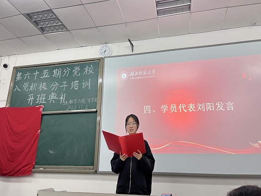 接着屈媛媛老师宣读从纪律要求、作业汇报、培养要求三个方面对党校纪律进行了具体介绍,随后学员代表刘阳发言表态。