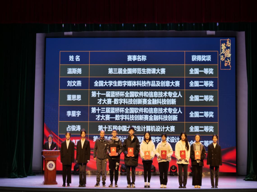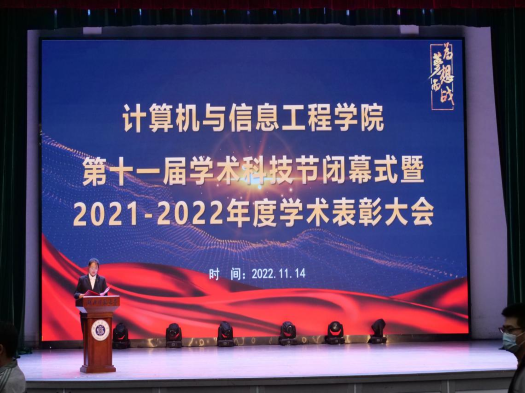 为对我院2021—2022年度学术科研创新表现优秀的学生和组织进行表彰和鼓励,调动学生参加科研创新的积极性。计算机与信息工程学院于11月14日19时在湖师大礼堂举行了第十一届学术科技节闭幕式暨2021-2022年度学术表彰大会。出席本次大会的嘉宾有计算机与信息工程学院党委书记王舒怀老师、院长杨杏本老师、党委副书记柯海燕老师、副院长童强老师、副院长彭绪富老师、副院长陈琦老师、各个工作室的指导老师及全体辅导员老师。