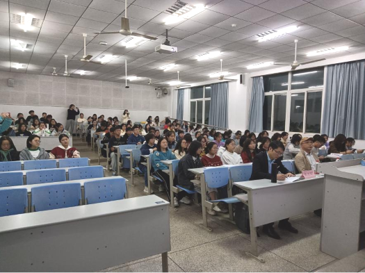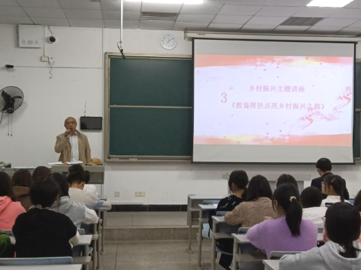 随后,郭在军教授进行乡村振兴主题讲座,分享他深入阳新县基层驻村帮扶五年的体会,并围绕乡村的变化、教育帮扶、农村教育工作重点三方面展开分析。他提出坚持落实“四个不摘”、发挥“湖师优势”、坚持“以点带面”的教育帮扶做法建议,着重强调了教师基本功的重要性,在场师生聚精会神,以热烈的掌声表示衷心感谢。