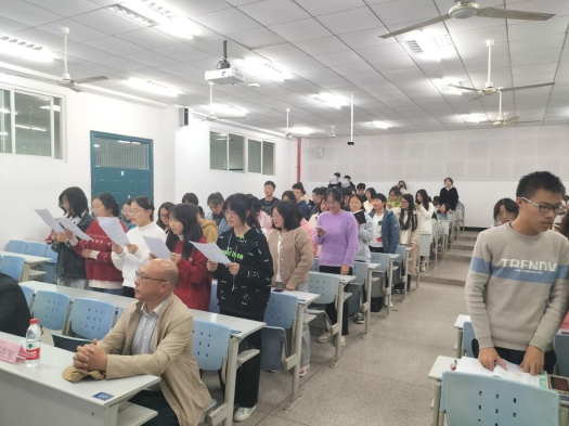 接着,在场学生踊跃向郭教授提问,郭在军教授进行详细解答后,由2201班、2202班同学合唱歌曲Auld Lang Syne。