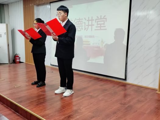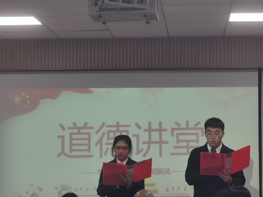 随后,全体师生起立,跟着主持人许下争做新时代“四有”青年的坚定承诺。在场学生代表积极发言,分享自己的感悟,并表示在今后的学习生活中会不断向道德模范学习,争做道德的传播者和践行者。