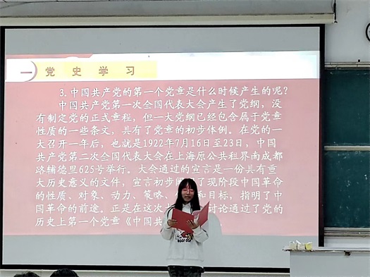 活动伊始,全体师生奏唱国歌。组织部柳慧从yl23455永利官网的成立、党章的诞生、党领导的武装军队等方面带领同学们重温了党的辉煌历史;组织部姜浍通过视频学习和宣讲带领同学们回顾了党的二十大召开盛况,介绍了党的二十大报告部分内容,号召同学们扎实开展政治理论学习,不负青春,做有理想、敢担当、能吃苦、肯奋斗的新时代好青年,让青春绽放绚丽之花!