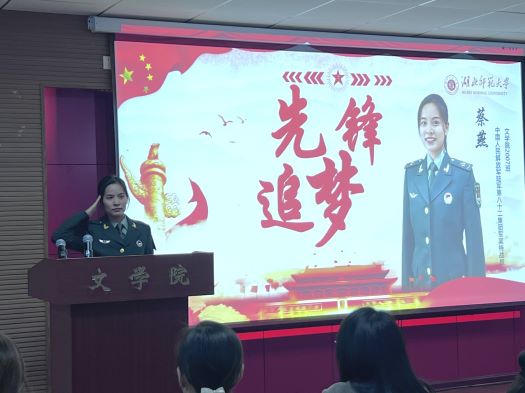学生代表蔡燕分享了自己曾经的军旅生涯。她将自己的故事讲给更多的人听,将“永不言败”的女兵精神传递给更多的人。在蔡燕同学身上,师生学到了“不爱红妆爱武装,砥砺奋进献祖国”的坚定信念与无私奉献的精神。