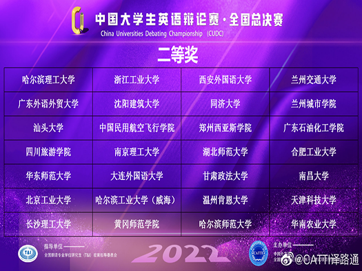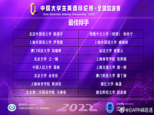 12月3-4日,2022年中国大学生英语辩论赛(CUDC)全国总决赛落下帷幕。由外国语学院英语辩论队教师团队担任指导老师,20级英语专业学生程家俊和徐娜组成的代表队,以全国第47名的优异成绩荣获全国二等奖。其中,程家俊以第10名的全国辩手排名获得“最佳辩手”(Top 10 Best Speaker)称号。