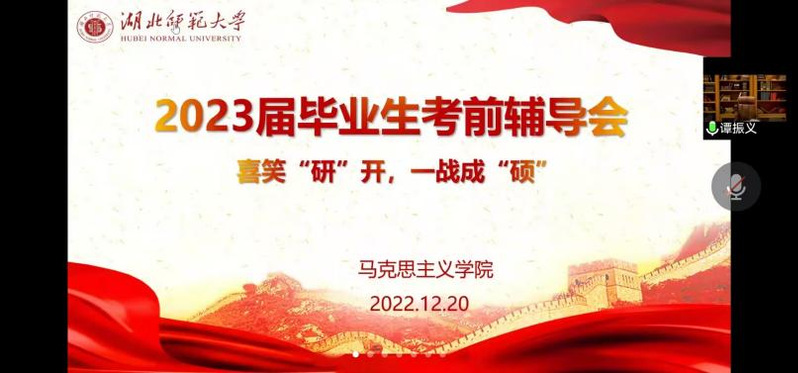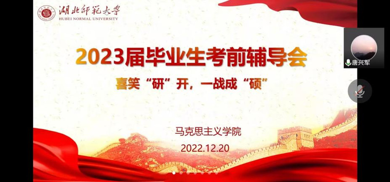 12月20日晚,我院2023届毕业生考前辅导会成功举行。参加此次会议的有我院党总支书记程焰、党总支副书记夏婷婷、副院长唐兴军、谭振义教授、辅导员郑小蓉以及2023届考研毕业生。