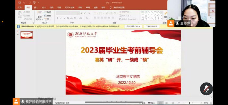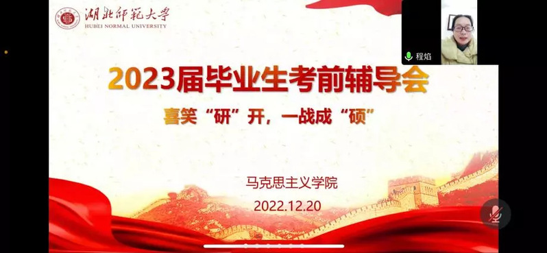 最后,夏婷婷作总结发言。在线上考研辅导会中,我院老师们为考研学子送来了暖暖的祝福与关心,帮助同学们稳住心态,坚定信心,掌握冲刺期备考技巧,愿我院所有考研学子在“研途”中矢志拼搏,成功上岸。