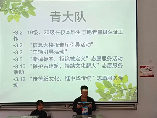会议伊始,由实践部部长郑莹莹进行红色故事领学,带领学生干部围绕遵义会议这一历史事件,学习党的不朽精神。紧接着,各部门部长就本部门近期工作成果和下一步工作计划进行总结汇报。随后,2205班班长与2105班班长就如何高效管理班级进行了友好交流,为进一步推进班级的良好建设分享经验。最后,由单紫云老师进行讲话,她就近期需要完成的升旗仪式、考研复试交流会以及运动会等工作内容做好相关安排,并希望各部门相互协作,多举办特色活动,创新发展学院文化,展现生科魅力。