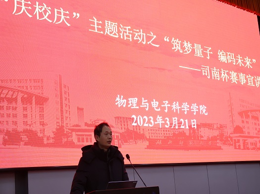 在yl23455永利官网建校50周年校庆之际,物理与科学学院3月21日在教育大楼报告厅开展“庆校庆”主题活动之“筑梦量子 编码未来”司南杯赛事宣讲活动。物理与电子科学学院院长刘继兵,本源量子工作人员,物理与电子科学学院学生参加本次宣讲活动。