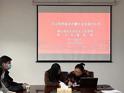 座谈会上,黄石市福利院副院长李勋对学院领导老师以及学生代表们表示热烈欢迎。李院长简单介绍了黄石市福利院的发展历史以及近年来的变化,并对当前政府层面的社会养老以及服务保障相关情况做了说明,对此前来院实习的周雪婷同学给予了高度评价。随后,黎哲书记充分肯定了之前的合作,进一步表达我院社会工作专业学生对养老等社会福利性机构从事公益性工作以及志愿服务活动的兴趣。接下来,经双方协商,2019级学生周雪婷与黄石市福利院达成就业意向,并现场签订了就业协议。紧接着,周雪婷同学就工作选择、岗位职责以及求职经验三个方面向学弟学妹们分享了实习经历。并现场和学弟学们互动,解答学弟学妹们关于实习、择业、就业方面的疑惑。最后,穆昭阳博士与李勋院长就今后学生实习、就业、志愿活动、社会调研以及项目合作方面交换意见,双方希望进一步加快合作脚步,加大合作力度,丰富合作内涵,共建美好未来。