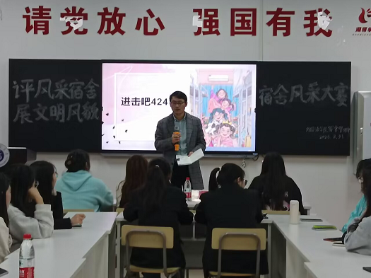为展现外国语学院学生宿舍风采,创建文明寝室,3月31日下午6时30分,外院宿舍管理部于25栋至诚一站式学生社区会议室开展了第三届宿舍风采大赛。参加此次活动的有外国语学院辅导员黄志军老师,自律委员会副主席沈蔚丹,宿舍管理部工作人员及报名此次比赛的各寝室代表。