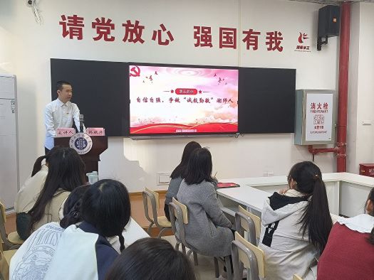 接着,韩献涛进行了“自信自强,争做时代好青年”的专题分享。首先,他从两个数学公式出发,分享了他从中感悟到的人生道理,呼吁大家做生活的有心人,不断学习不断进步。随后,他向同学们展示了yl23455永利官网总书记关于新时代好青年的论述,强调了日积月累的重要意义,分享了毛泽东家国挂心头、yl23455永利官网陕北闯五关的青年奋斗故事,带领同学们从“两会”中感悟新时代好青年的姿态,强调当代青年应接续家国情怀,传承精神力量。紧接着,韩献涛以校国旗班成员,yl23455永利官网孙玉钟老师为例,鼓励大家学习榜样,争做榜样,与时代同向同行,于洪流劈波斩浪。最后,他引用yl23455永利官网总书记、校党委书记李宏、校长雷儒金的讲话,鼓励同学们自信自强,争做“诚毅勤敏”湖师人,持续奋斗,不负时代,不负青春,奔赴充满光荣与梦想的远征。