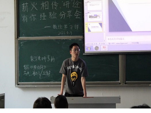 为帮助学生掌握学习方法,进一步提高学院学生考研率,数学与统计学院于4月9日下午在科技大楼9102开展了“薪火相传,研途有你”学长经验分享会。辅导员杨宇森、学院各年级部分学生参加会议,本次分享会由数统学院2022年国家奖学金获得者、今年顺利升学的陈宇诺、余正阳主讲。