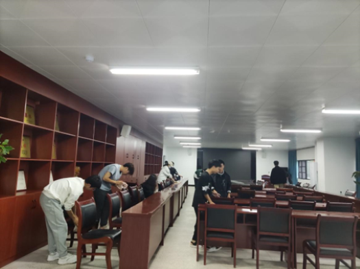 在学生第二党支部邓艺同志进行活动介绍和任务分配后,所有同志迅速参与到实践当中。按照预先分组分别对学院二级心理辅导站、档案室、大小会议室进行卫生清扫。在二楼的二级心理辅导站和档案室,同学们认真清扫地面,擦拭桌椅,洁档案缝隙间的灰尘,并完成了档案整理;在三楼的两间会议室,同学们对窗户、桌面、地面进行了全方位大扫除,会议室焕然一新。在大家共同努力和辛勤付出之下,相关办公场所卫生环境得到极大改善,得到了师生的一致好评。