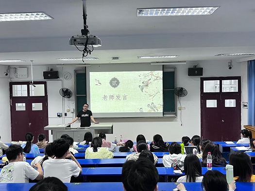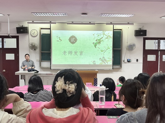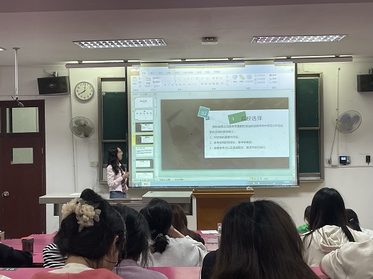 汉语国际教育会场,李治平鼓励同学们选择适合自己的人生道路,做好学习规划,用积极的探索代替选择的迷茫,全力以赴、定有所成。随后1904班闵馨瑶、卢晓萱先后围绕学校以及专业的选择、备考环节、考研信息收集等话题与学弟学妹们进行了交流,已求职成功中国农业银行的1904班的杨含玥也结合自己求职经历给大家做了系统的分享。
