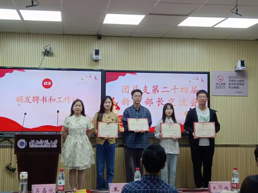 会议伊始,吴嘉欣,王奡骏上台发言,他们建议新任部长应该尽快完成干事到部长身份的转变,以最好的状态迎接部门活动,并指出团学工作的不足之处同时提出意见与解决方法。接着,全体部长观看了第二十三届团总支部长的视频寄语,上届部长们以暖心话语鼓励新任部长踔厉奋发,笃行不怠。随后,王浩老师为部长们颁发聘书和工作证,并进行合影留念。会议最后,王浩老师在总结时对各部门日后的工作进行了规范与指导,并表示部长们应树立起“三意识”与“三责任”,有效做好工作衔接,加强沟通交流,为学院团总支建设工作同担责任,共谋未来。