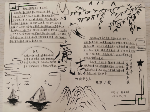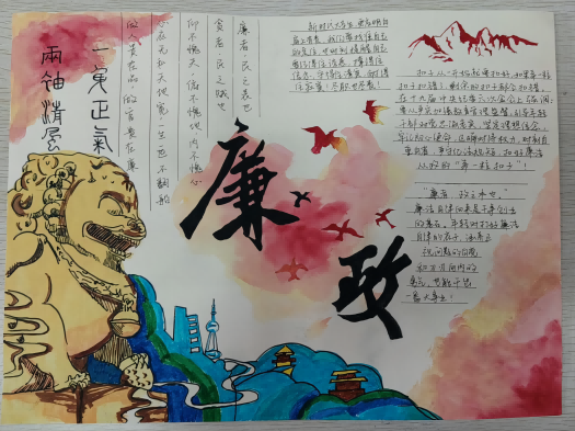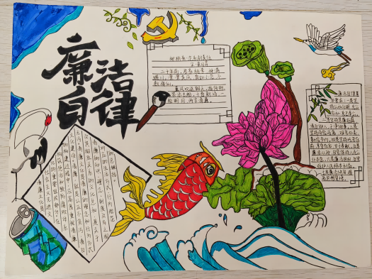 本次活动共征集到了五十余篇手抄报作品,选手们以廉洁诗词和故事等为载体,用党徽、莲花、竹子等为装饰,运用素描、水粉、油画等多种形式描绘出自己心目中的廉洁,表达了对廉洁文化的向往与崇敬。经过评选,高婧莹、郑雨璇荣获一等奖,袁子慧、郭惊哲、唐怡婧、王先宇荣获二等奖,孙佩鑫、王莹、甄紫琦、张文熙荣获三等奖。