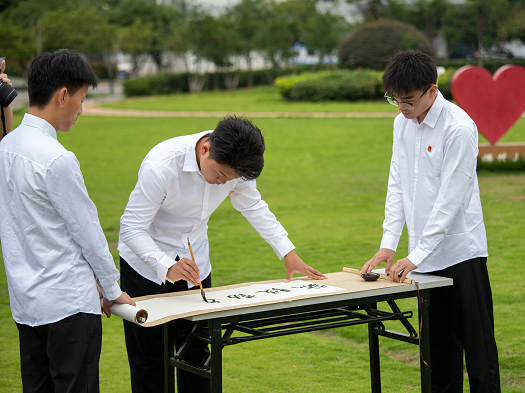 现场书法的陈天鹏同学神情自若,握笔有力,一笔一划,尽显书法功底。