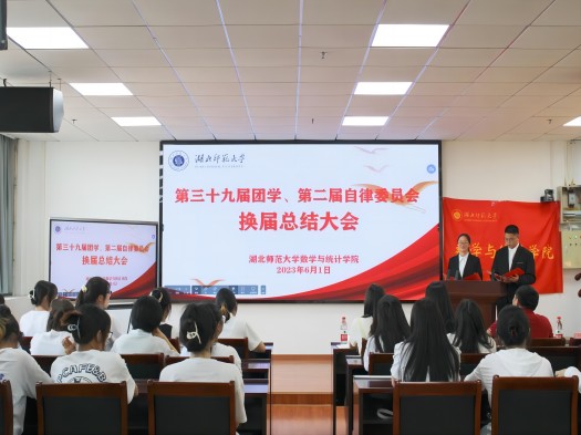 为总结2022-2023学年度学生工作,加强学生组织队伍建设,数学与统计学院于6月1日下午四点在10603报告厅召开第三十九届团总支学生会、第二届自律委员会换届总结大会,数统学院党委副书记王本成,辅导员何金燕、屈媛媛、杨宇森、苏梦月以及全体学生干部参加会议。会议由邱雯慧和郑梓榮主持。