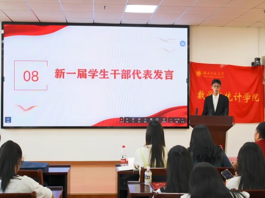 随后,屈媛媛老师宣读新一届学生干部名单,并对相关工作进行了强调。新一届学生会副主席蒋秋阳代表全体学生干部承诺,将接续数统组织的优良经验和传统,同时改革创新,共同把数统学院学生组织建设成有担当、有干劲、有想法的有力团队,更好地为学院学生工作服务。