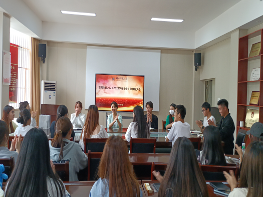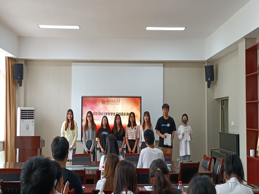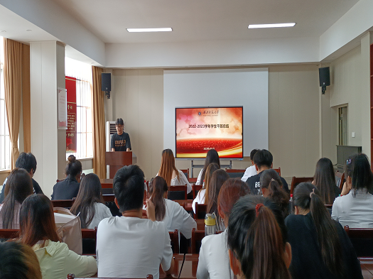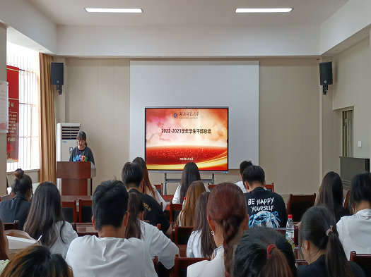 会议第一项,2022-2023学年学生干部总结,第十八届团总支副书记王欢、第二届自律委员会主席孙亚宁、第十八届团总支项目部部长孔玉如玥、社会实践部部长毛逸扬依次上台发言,讲述自身在团学组织的成长与收获,并向新任干部们传授了工作经验,提出了殷切期望:希望每位干部强化自身的责任意识,提高自己的服务意识,平衡好学习与工作的关系,以身作则、率先垂范,在新的工作岗位上做出更突出的贡献。