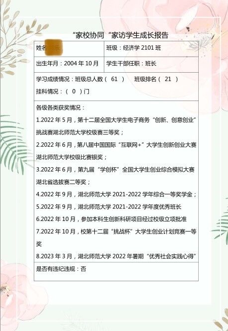 “三百”育人行动计划是学校重点打造的资助育人工作品牌,是围绕学生、关照学生、服务学生的有效举措。本次家访活动走进学生的家中,近距离感受学生的成长环境,进一步增强了家校协同育人的有效性、针对性和持续性。据悉,经管法学院为暑期家访的160余名学生精心制作了个性化的成长报告,全面展示了学生在校期间学习、任职、实践、获奖、受助情况,并附有班主任用心撰写的评语。小小的成长报告能让家长清晰了解学生的在校表现,为学生指出不足,指明努力的方向。