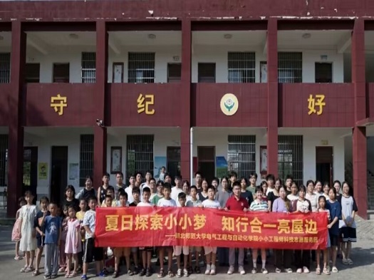 7月13日下午,电气工程与自动化学院行政助理陈兮、辅导员王昭涵,屋边村党支部副书记费新法来到新港园区金海管理区屋边小学慰问正在开展暑期“三下乡”社会实践的“小小工程师”实践队成员。