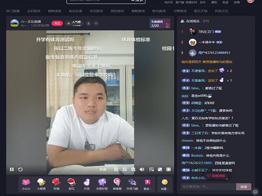辅导员李亮首先向同学们作了正式的自我介绍,对加入体育学院的新生表示了热烈的欢迎。党委副书记杨丽分享了学院的整体情况,针对新生入学后的角色转变等方面向新生分享了入学前建议,希望同学们成为有目标、有动力的青年才俊,发展智慧体育,成为新时代的体育人。随后,刘洋对本次新生报到的包括、校园卡的充费、团关系转接、资助政策、户口迁移、银行卡申领、军训线上教学、班级分配等新生关心关切的问题进行了逐一说明,并对新生们的抖音弹幕消息等新生关注的问题一一进行解答,会议直播过程中互动热烈。