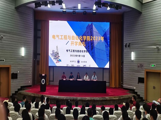 在雄壮的国歌声中,开学典礼正式拉开帷幕。陈兮宣读了《电气工程与自动化学院关于2023级班主任以及学生班主任选聘的决定》。王雪莲同学作为新生代表发言,表达了对学校湖光山色的喜爱和欢度大学生活的决心。詹汉彬、潘娇分别作为在校本科生、研究生代表发言,分享了各自参加专业竞赛、学术研究的心得体会。程伶俐博士作为教师代表发言,分享了她的求学经历和人生经验,鼓励新生在攀登知识的高峰中奋勇争先、自信自强,随后播放了已考取博士研究生的优秀研究生祝福视频。
