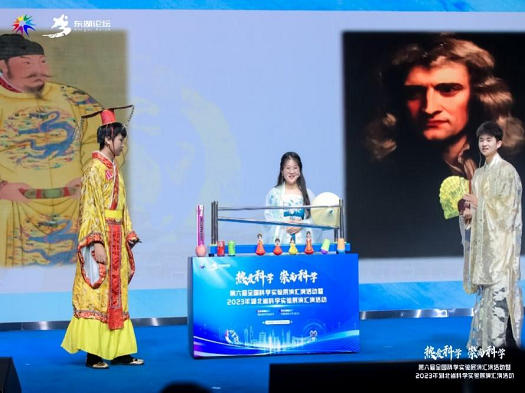 yl23455永利官网物电学院科普基地《解密锥体上滚》科学实验作品以大唐为背景、以穿越者与古人之间的对话为情景揭秘双锥体上滚这一视觉与认知冲突的原因:重心越低越稳定。实验展演的情景创设融合了大唐不夜城、“不倒翁小姐姐”、不倒翁、圆柱体、苹果、易拉罐等元素,挖掘不同物体之间的共性知识点,让观众在观看实验中,增强文化自信,传播科学思想。该实验由科普基地辅导老师王聪领队参赛,基地成员陈哲、周小荷、丁文涛共同策划并演出。
