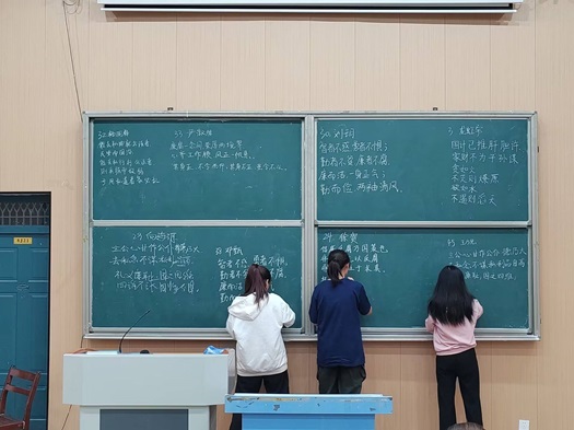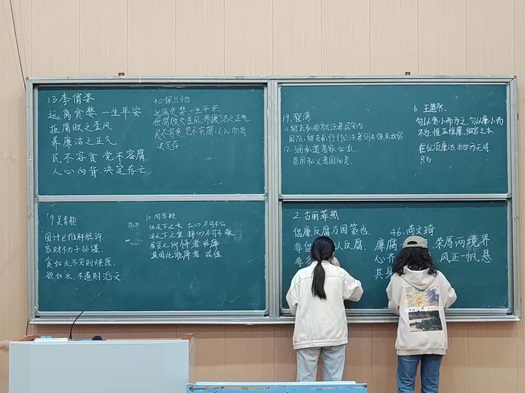 比赛在主持人宣读比赛规则和注意事项中正式开始,各参赛选手依照抽签顺序,每组四人上台书写各自抽选的书写材料。比赛过程中,每位选手在限定的时间内,全神贯注地在黑板上挥洒书写豪情,有的洒脱大气、有的遒劲刚毅,有的飘逸舒展,书到深处见文化,写到极致见精神。比赛结束后,由书法协会会长段雪进行总结发言,她对选手们的表现给予肯定,并提出了一些建议,让同学们注重写字章法,并期待同学们在未来展现更好的作品。
