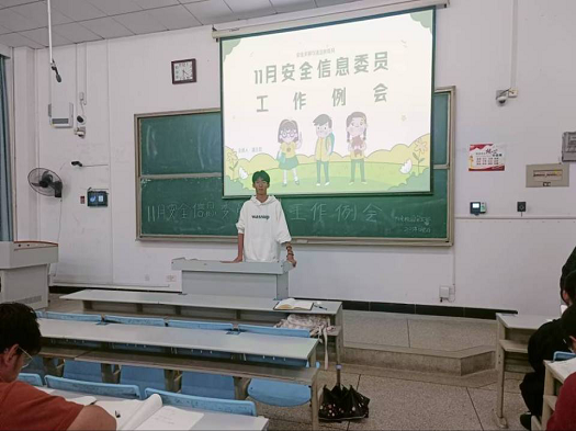 会议伊始,学院校园安全部副部长潘立晨提醒各班安全信息委员要以身作责,认真聆听本次工作例会的内容。随后,他从校内课间安全、道路交通安全、消防用电安全、防溺水安全、防范网络诈骗、饮食安全这六个方面进行了安全知识普及。