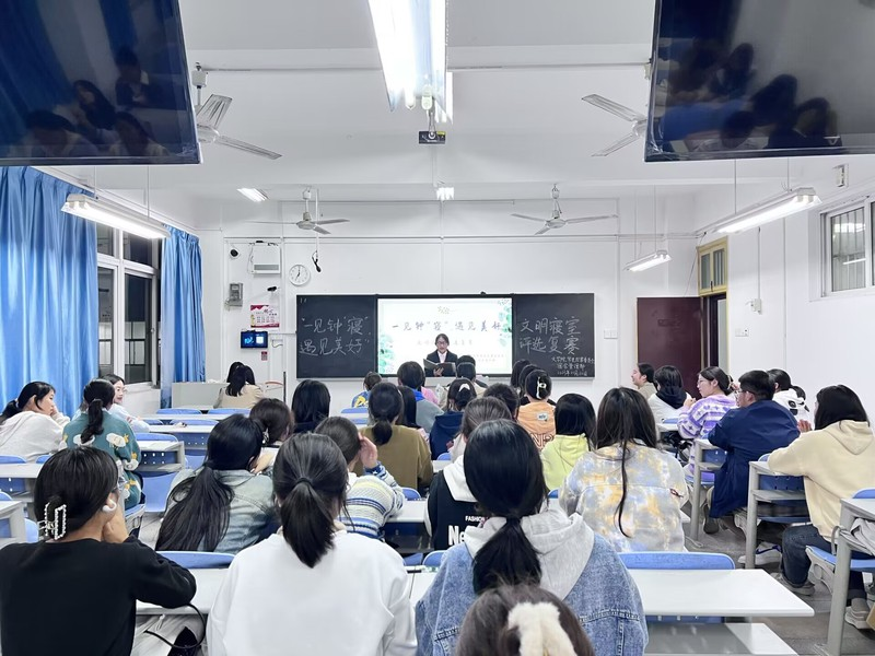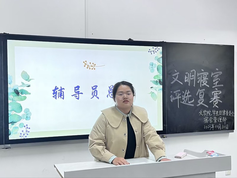 为增强宿舍凝聚力,提高宿舍生活质量,进一步丰富学生大学生活,营造良好的校园文化氛围,2023年11月10日晚7点,文学院学生自律委员会宿舍管理部于教育大楼1422教室开展主题为“一见钟‘寝’,遇见美好”文明寝室评选复赛。辅导员董雅芳、团总支副书记崔俪馨、青大队主席肖雅倩、学生自律委员会学风建设部陈溪宁和张菲菲二位部长担任评委,比赛由宿舍管理部干事谢妙主持。
