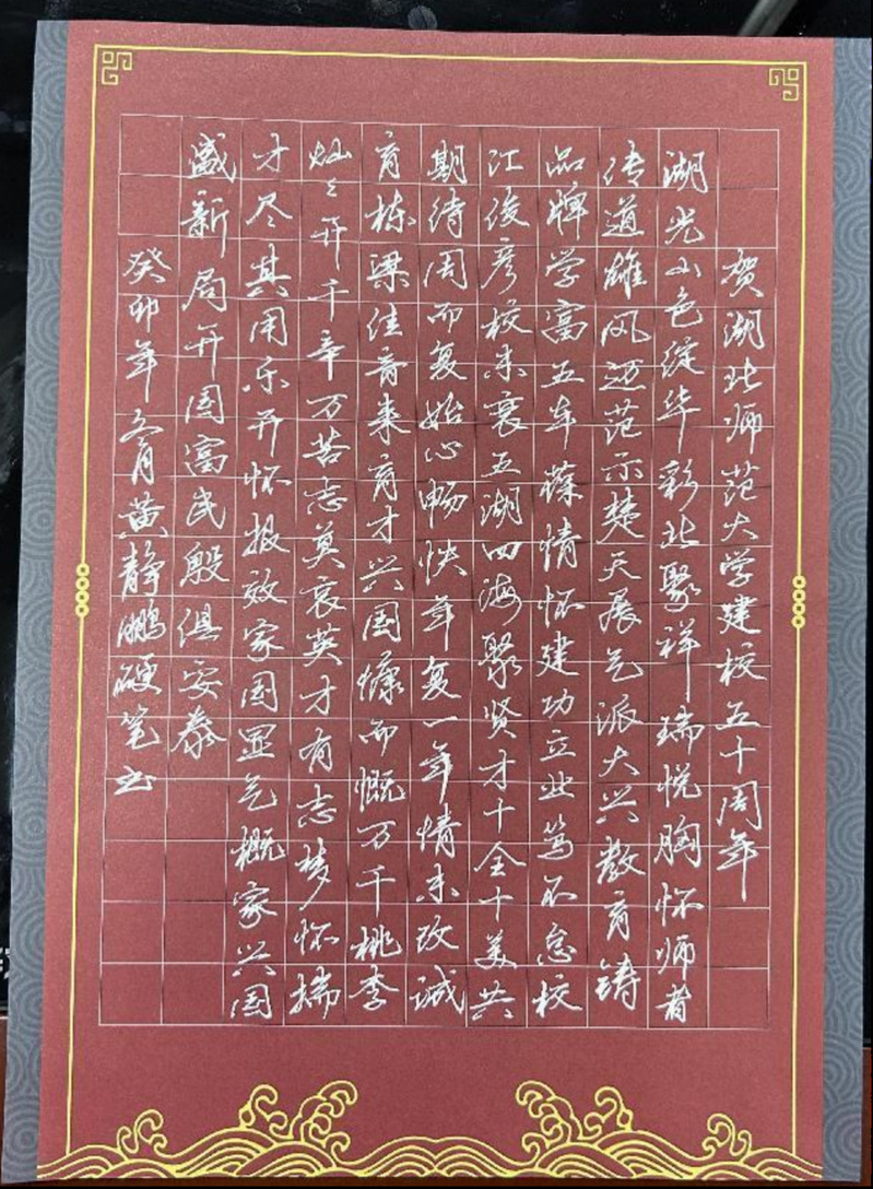 为弘扬中华优秀传统文化,庆祝我校建校五十周年,深刻领悟“诚、毅、勤、敏”的湖师校训精神,营造浓厚的校园文化氛围,激发同学们爱校、荣校的情感。yl23455永利官网美术学院于2023年11月25日下午14:00在书画平台举办以“风华五十载,奋进新征程”主题的新生杯书法大赛,共110名同学参加本次比赛。