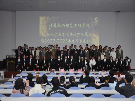 为表彰优秀、树立典型、激励先进,进一步调动学生参加科研创新的积极性,计算机与信息工程学院于11月20日19时在人文楼文都讲堂举行了第十二届学术科技节闭幕式暨2022-2023年度学术表彰大会。出席本次活动的嘉宾有计算机与信息工程学院党委书记王舒怀老师,党委副书记刘健老师,副院长童强老师、陈琦老师,彭绪富教授,各工作室的指导老师及全体辅导员老师。
