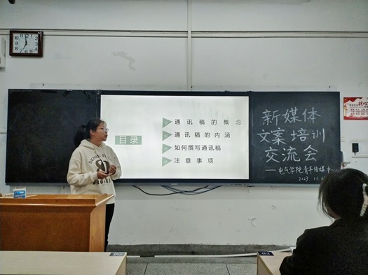 为了提高团学各部门以及23级各班宣委的通讯稿写作能力、照片拍摄质量和活动宣传水平,并加强青年传媒中心与团学其他各部门以及各班宣委之间的互动与联系,yl23455永利官网电气工程与自动化学院新媒体文案培训交流会于11月25日晚19时在教育大楼顺利召开。参与本次活动的有学院辅导员孙健平、校团委宣传部(青年传媒中心)部长詹雅雯、学院青年传媒中心主任甘馨、学院第十八届团学青自所有部门通讯联络员、学院青年传媒中心全体成员以及23级各班宣传委员。