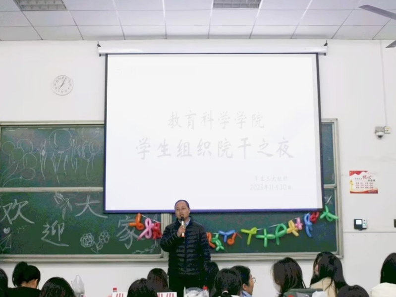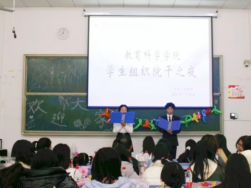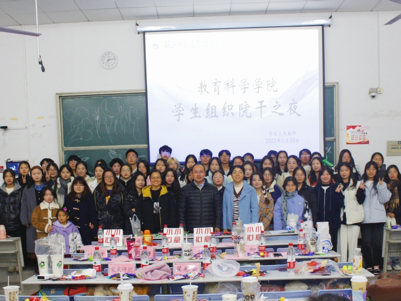 为了增强组织的凝聚力,帮助各部门成员互相了解,增进彼此之间的感情。教育科学学院学生会秘书部与学生自律委员会秘书部于11月30日晚七点在科技大楼9103联合举办第二十四届团总支学生会和第三届学生自律委员会院干之夜活动,参加本次活动的有教育科学学院党委副书记刘广兵,辅导员秦姗姗、刘丽娟,学生团总支副书记刘新宇、段小芳,学生会主席宋米岍玥、翟彩云,学生自律委员会主席金依、岳柳以及三大组织全体部长和干事。
