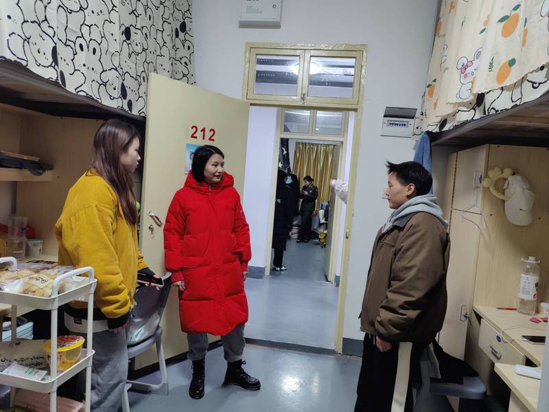 在走访过程中,严海燕与学生们问生活、谈学业,她详细了解了同学们的返校情况,她提醒同学们要做好新学期的规划,安排好新学期的专业学习,勉励大家珍惜时光、刻苦学习、健康生活,以饱满的热情迎接新学期。周曙与同学们进行了暖心交谈,他叮嘱同学们返校后要遵守校内各项相关规定,养成良好的生活作息习惯,提高安全防范意识,注意寝室用电安全,禁止使用大功率电器,特别是电动车充电问题。他鼓励考研的同学们积极准备复试,尽快调整状态,并就考研复试的相关问题进行了答疑和指导。杨丽重点关心同学们寒假学习生活情况和新学期开学的准备情况,她指出同学们在新学期应明确学习方向、合理规划时间,树立新学期的目标,以求在新的学期取得新的收获。她特别强调同学们要树立安全意识,校园内使用电动车应遵守各项规定。朱施成对同学们提出了新的要求并殷切期望同学们能提高学习热情,尽快调整作息模式,恢复学习状态,刻苦钻研,用实际行动继续书写大学生活的精彩篇章。