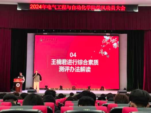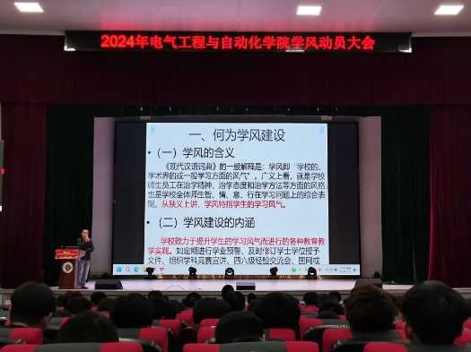 为进一步加强学院学风建设,营造良好的学习环境与氛围。电气工程与自动化学院于3月17日晚19时成功举办2024年学风动员大会。参与本次大会的有学院教学办孙怡老师,辅导员孙健平、王昭涵,学生代表王楠君、屈平安、魏宝兰、卢丽娜以及全体22,23级学生。