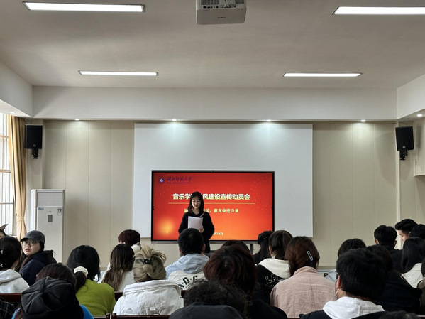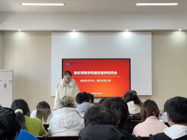 为了促进形成良好的校风、班风、学风,营造奋发向上的学习氛围和良好的育人环境,培养学生良好的学习习惯。3月14日,音乐学院学风建设动员会在13311会议室举行,会议由秘书部汤唯主持,党委副书记杨娇、辅导员付思墁、汪佳龙老师、团学组织全体干部和班干部代表参会。